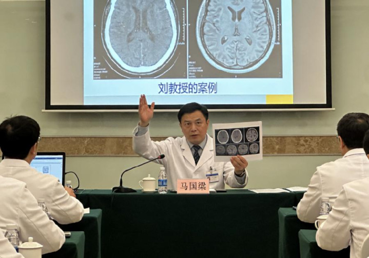 溶栓药物刚开始输入不久,马国梁即出现剧烈躁动,伴随恶心、呕吐反应,面色苍白、呼吸加快。医护人员一边安抚病人情绪,一边严密观察脑水肿和生命体征变化,准备应对可能的脑疝。