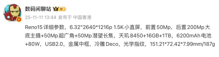 今天,博主@数码闲聊站 在爆料中提到了Reno15的详细参数。